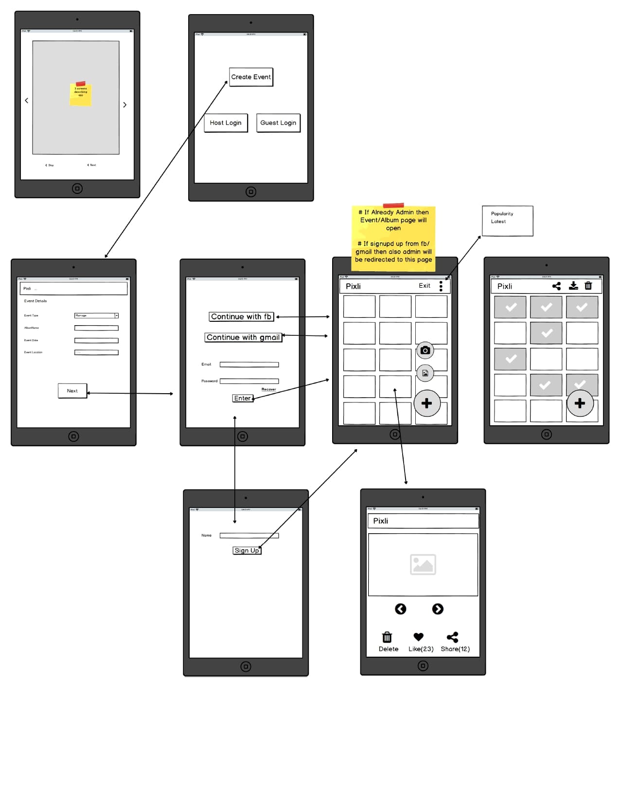 Initially we drew a sketch to identify the different users interacting with our application and then catering to their various needs. The user would either be a guest or a host. The host would create an event for which a code would be generated. This code would give access of the event's photos to anyone who has it. The Guest Login was kept keeping in mind the older generation who might not have email-id and would not be able to sign up. So, they could just enter the event code and access the event photos. The event attended and created would be saved to the database of the users who have signed up. No profile would be maintained for users of guest login.